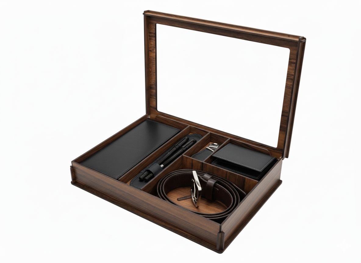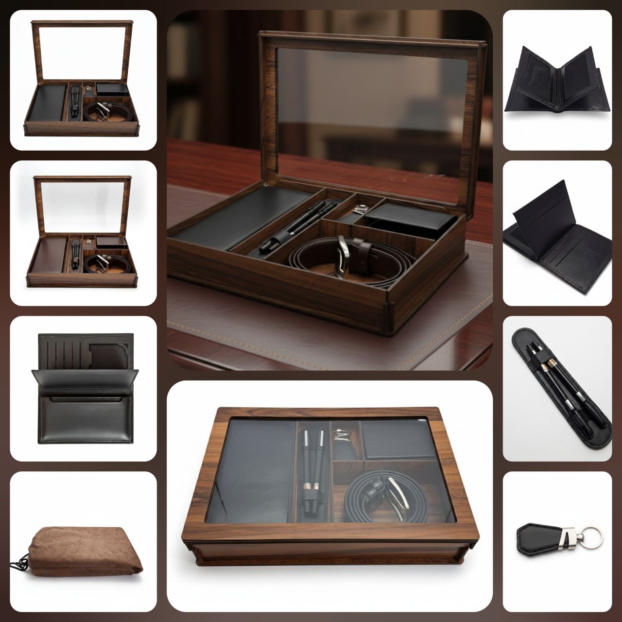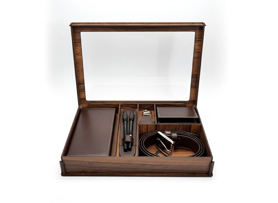 ست چرم مردانه 5 تکه چرم طبیعی گاوی جعبه چوبی مدل ماهور