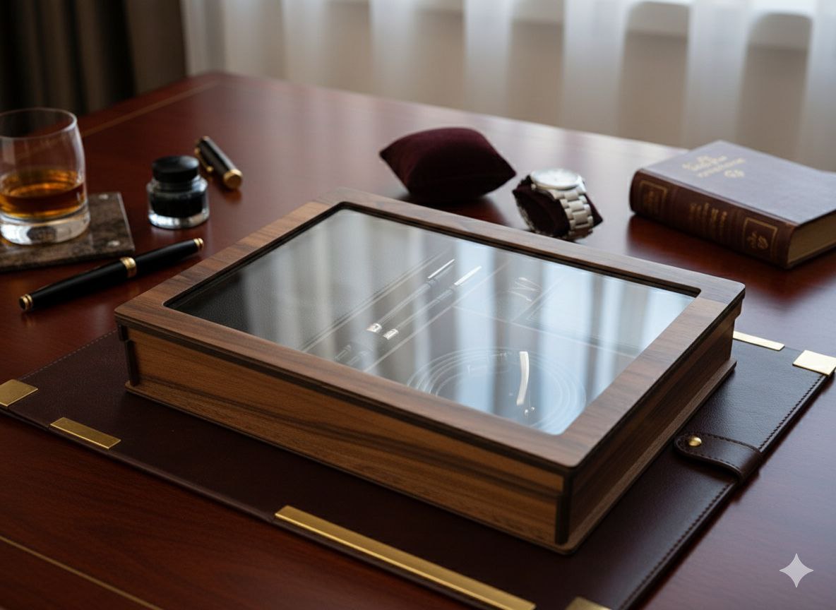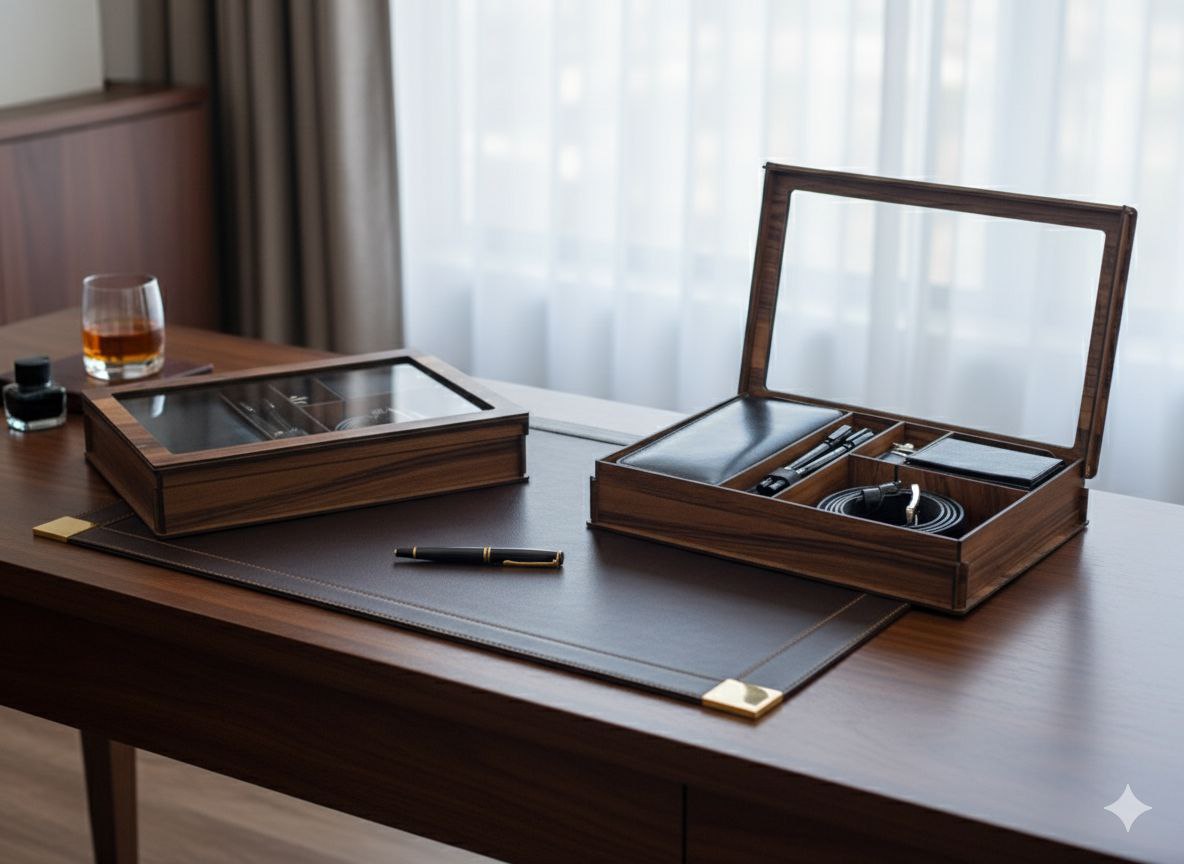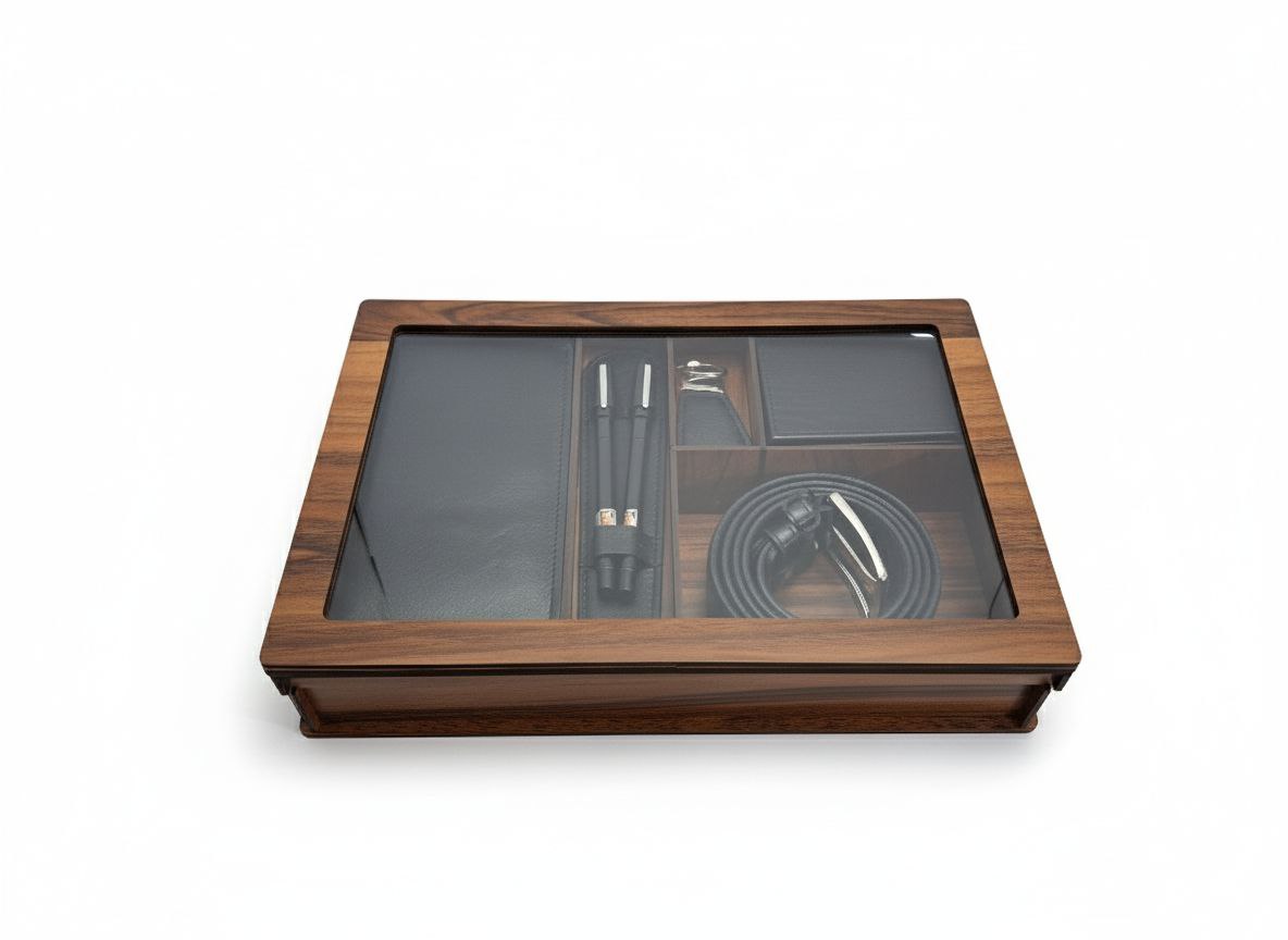 ست چرم مردانه 5 تکه چرم طبیعی گاوی جعبه چوبی مدل ماهور
