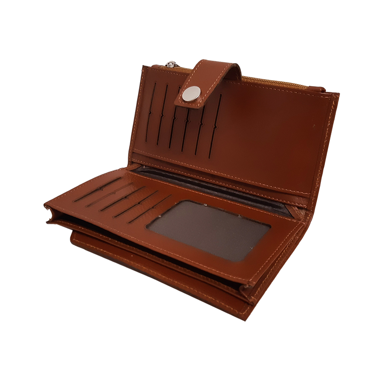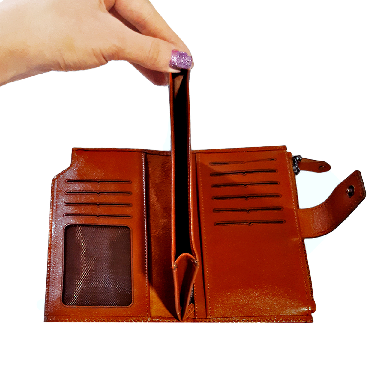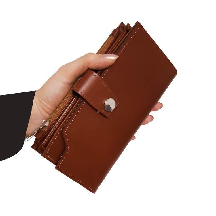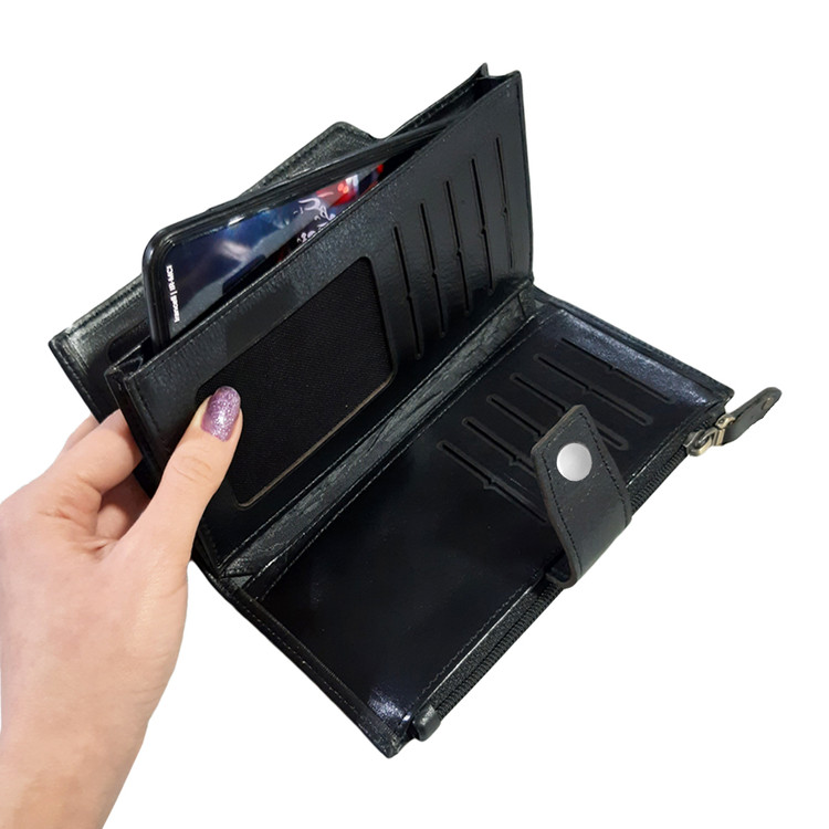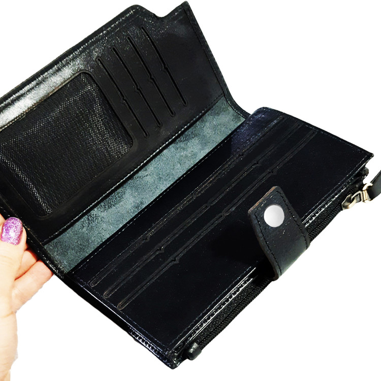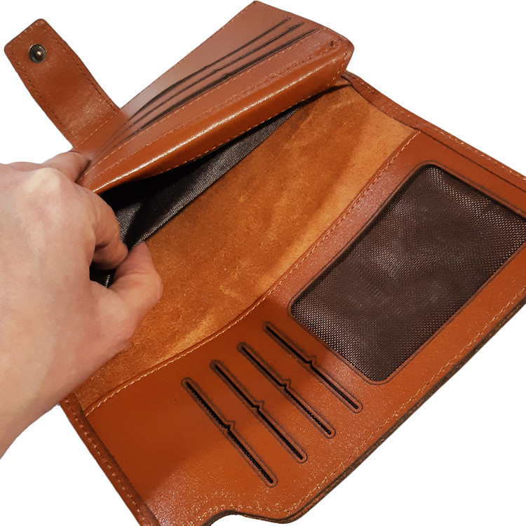 دارای محفظه مخصوص موبایل ،محفظه زیپدار و چندین محل مخصوص اسکناس، کارت، مدارک و غیره