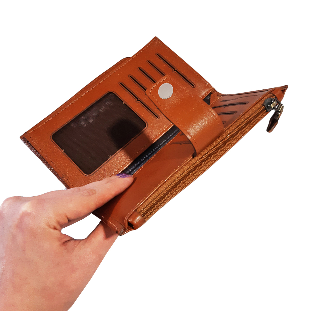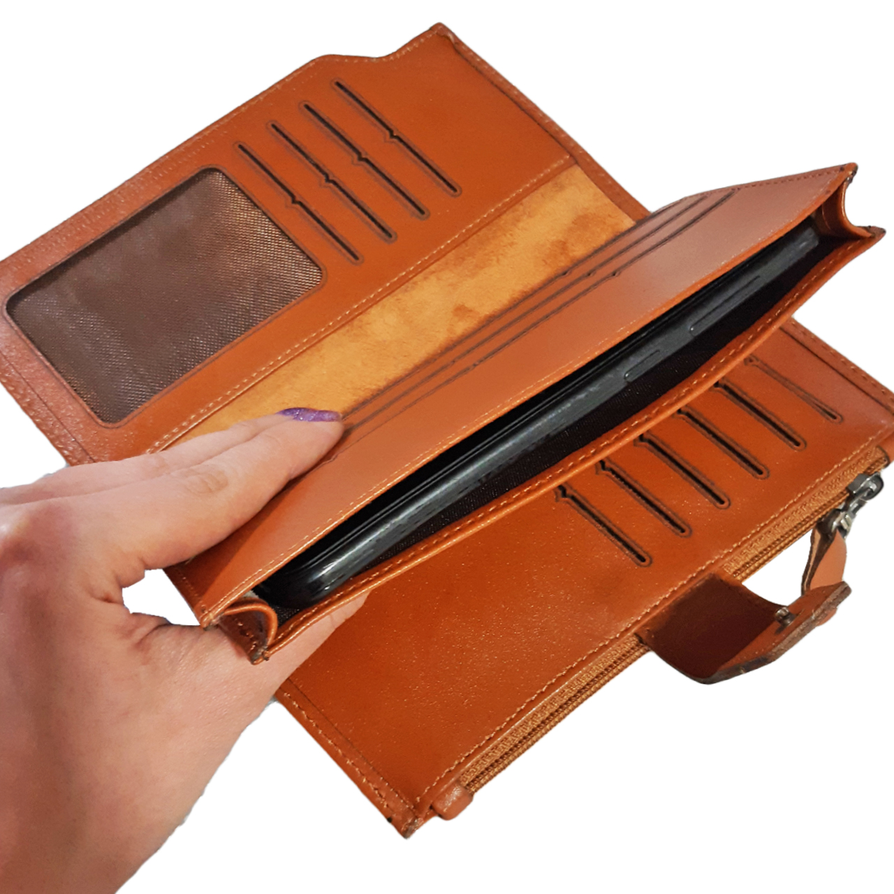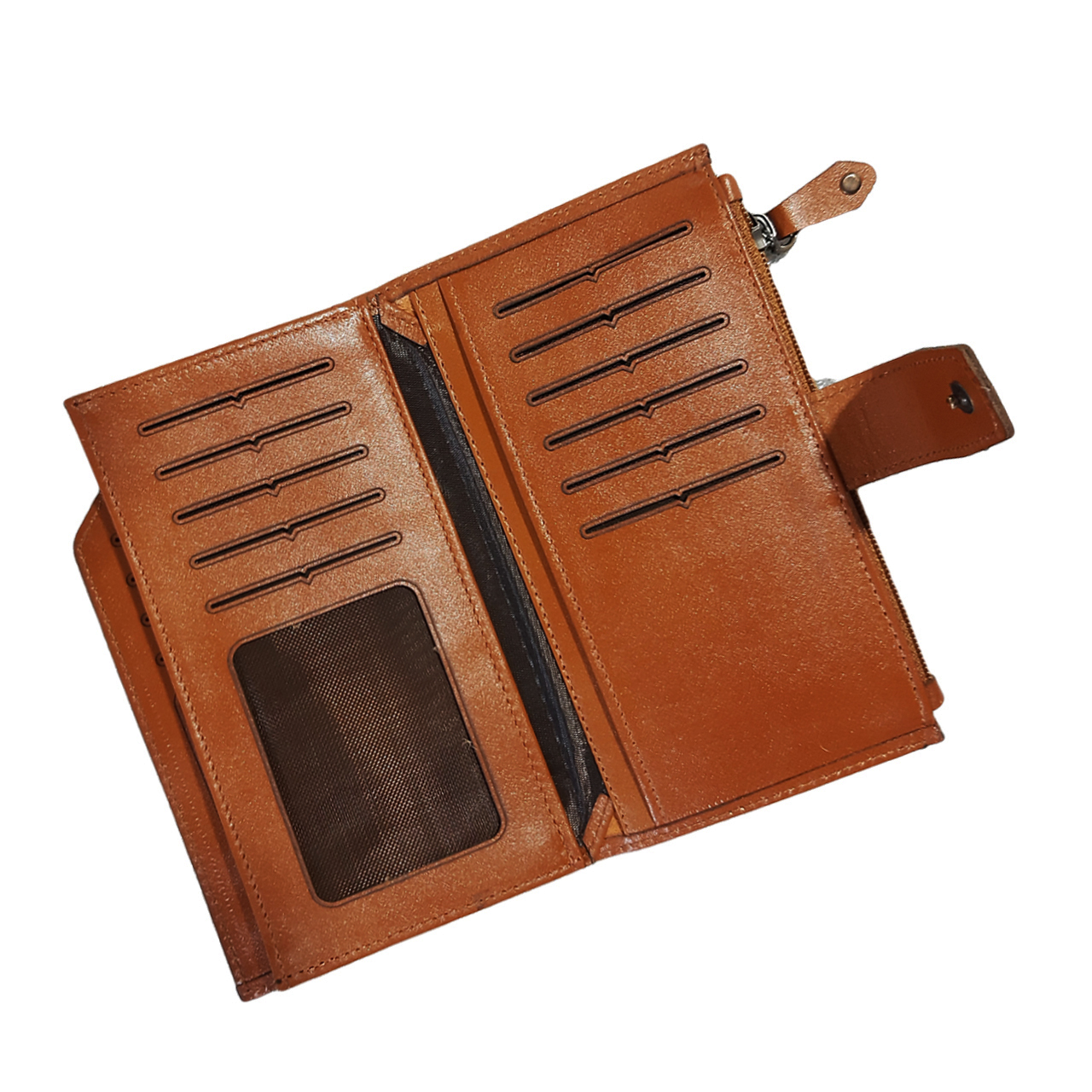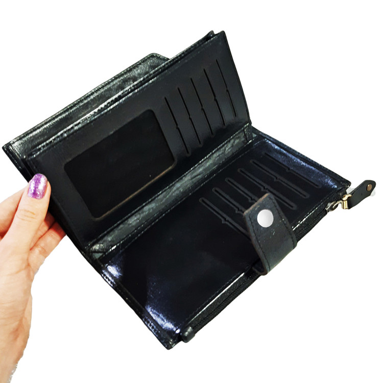 دارای محفظه مخصوص موبایل ،محفظه زیپدار و چندین محل مخصوص اسکناس، کارت، مدارک و غیره