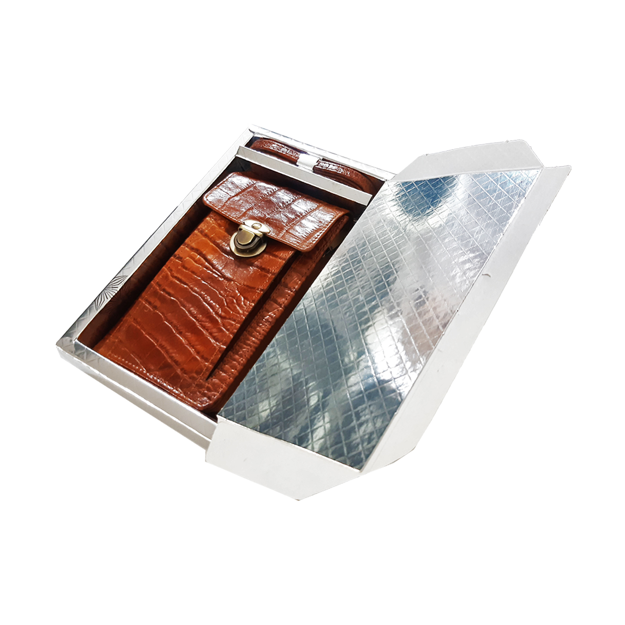 دارای محل مخصوص موبایل و چندین محفظه مختلف مخصوص مدارک، کارت، اسکناس، پاور بانک و غیره